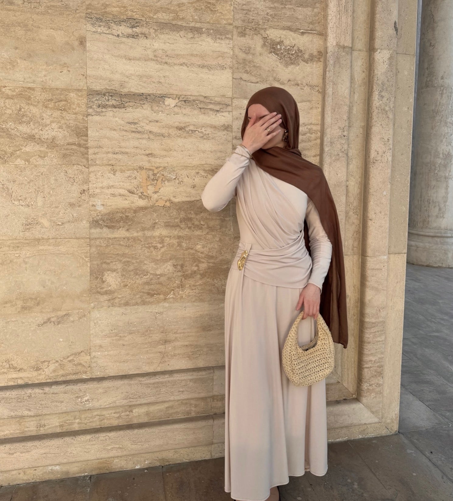 This elegant long-sleeve dress features a soft beige tone with a flattering draped waistline, accented by a gold-toned broche detail for added sophistication.