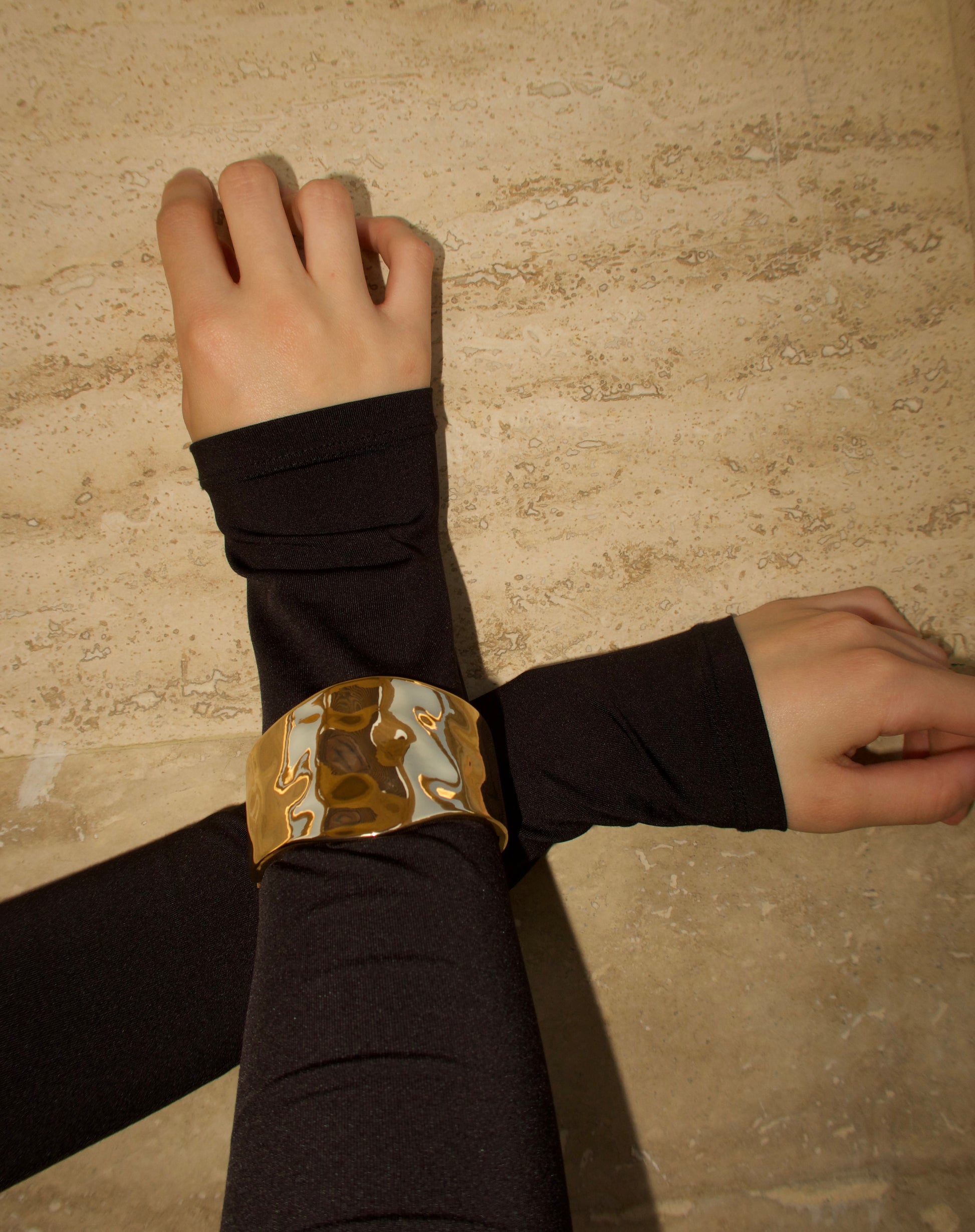 A bold hinged cuff bracelet with a molten gold surface and a smooth, sculptural curve. The hammered texture captures light with every movement, giving the piece a fluid, organic glow. Designed with a secure clasp opening for ease and structure — no need to bend or adjust.