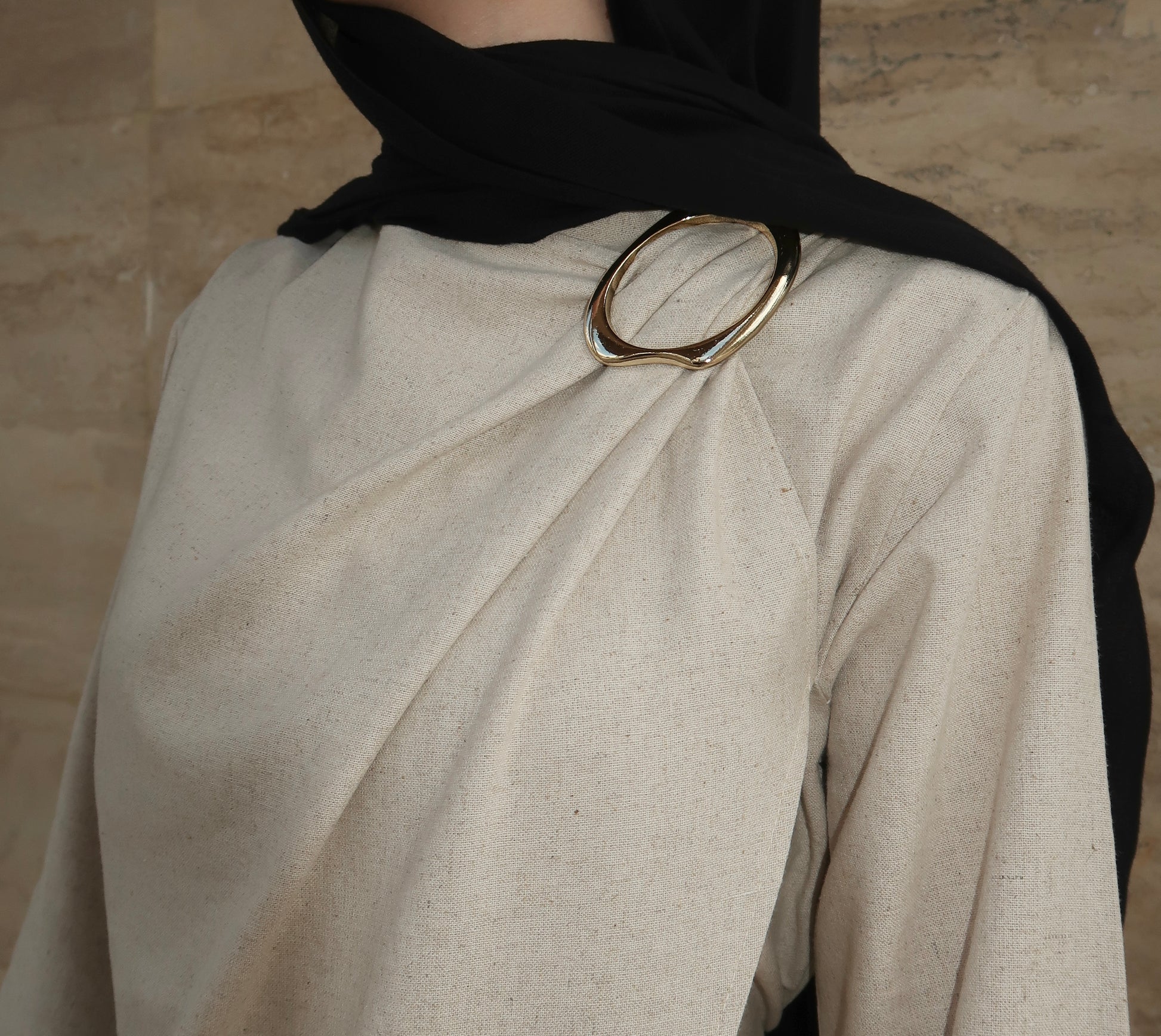 This is a minimalist, asymmetrical top in a soft beige tone, featuring wide sleeves and a diagonal wrap-over design secured with a small broche detail at the shoulder.