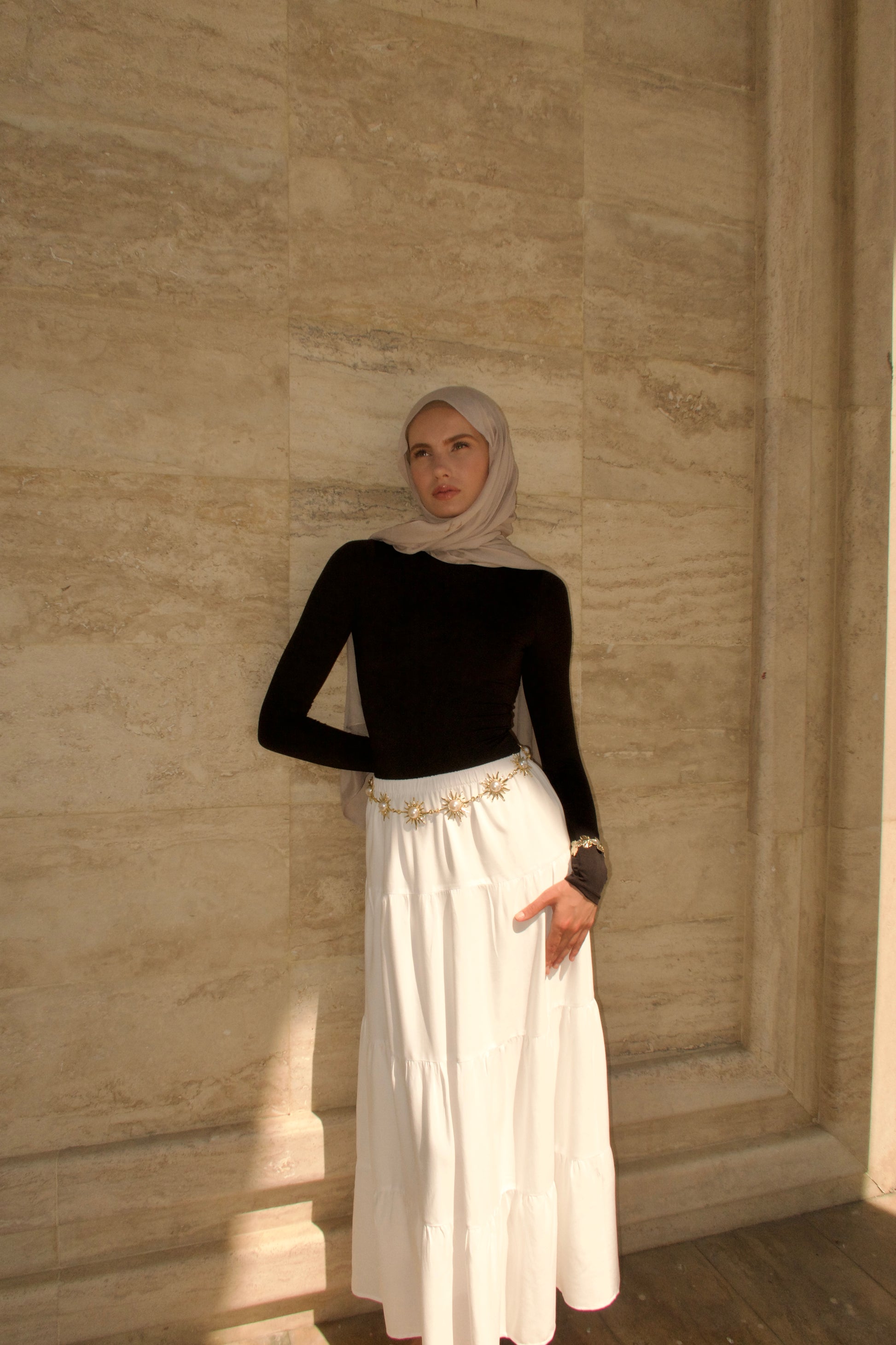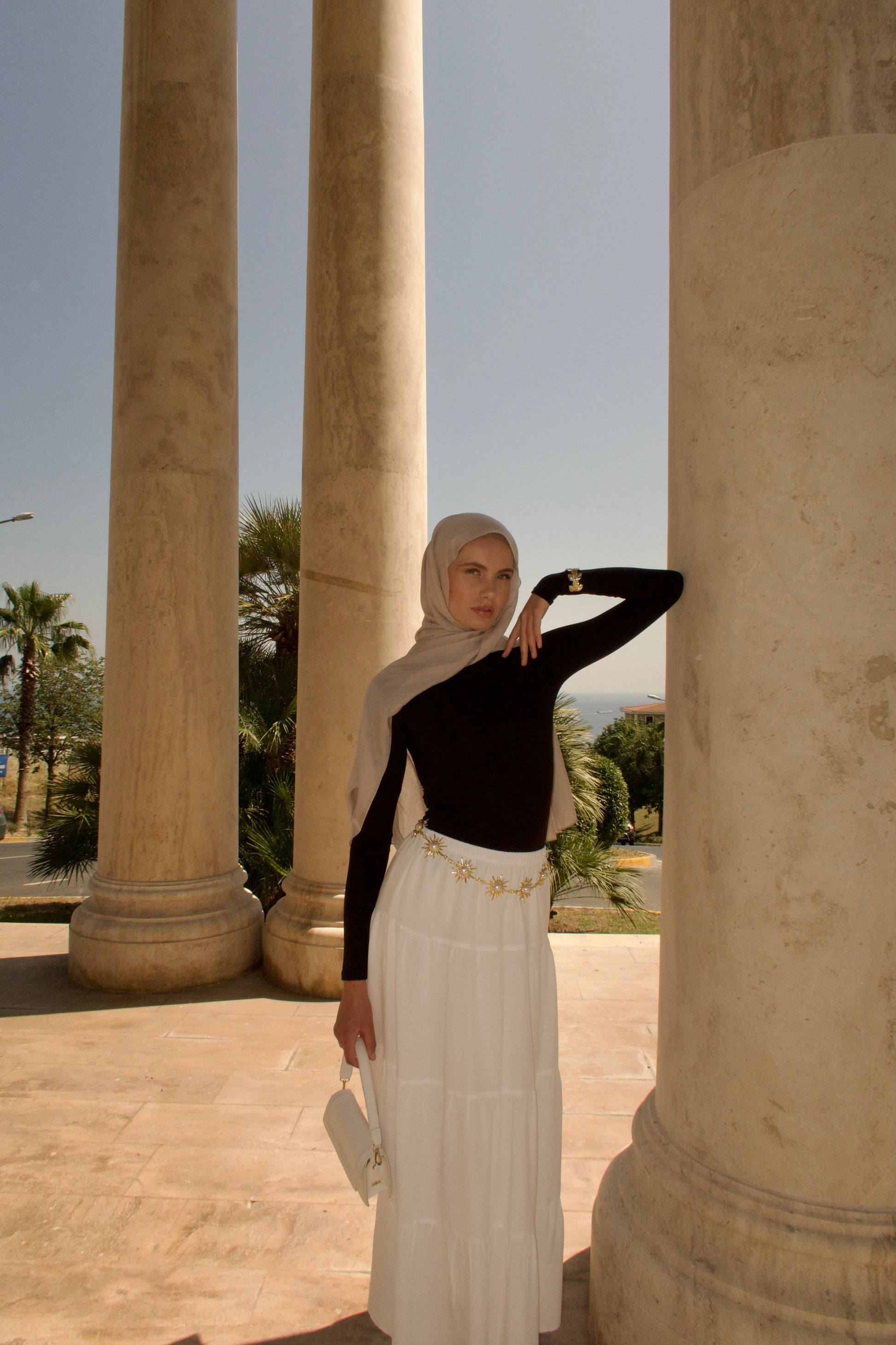 A tiered white maxi skirt with a clean, structured silhouette. Designed to offer movement and elegance in every step, it’s a timeless piece that pairs effortlessly with any top.