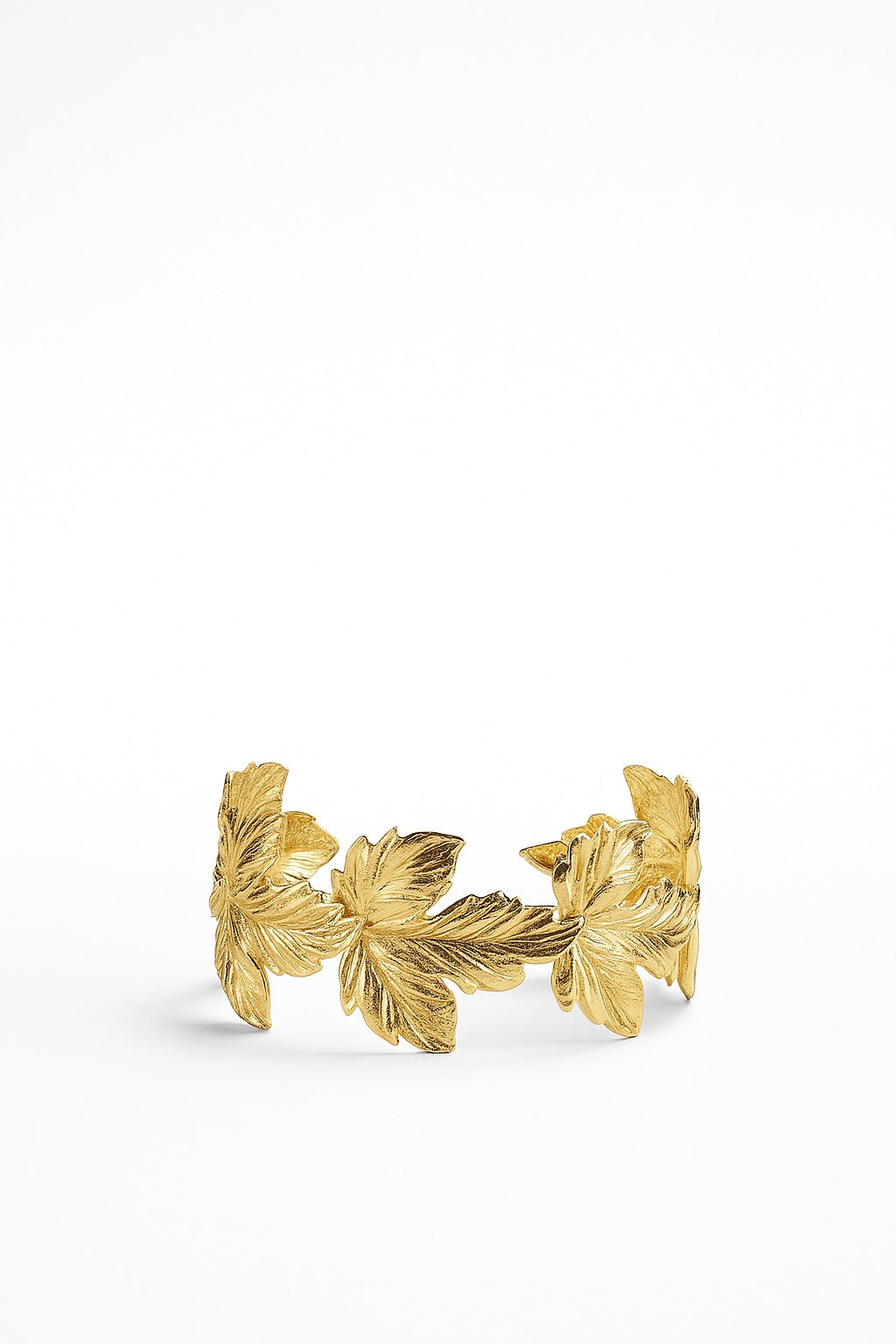 A sculptural open cuff bracelet, featuring intricately overlapping leaves with fine vein details. The lifelike texture and soft curves create a natural, elegant silhouette that wraps gently around the wrist. Lightweight and adjustable for a comfortable fit.