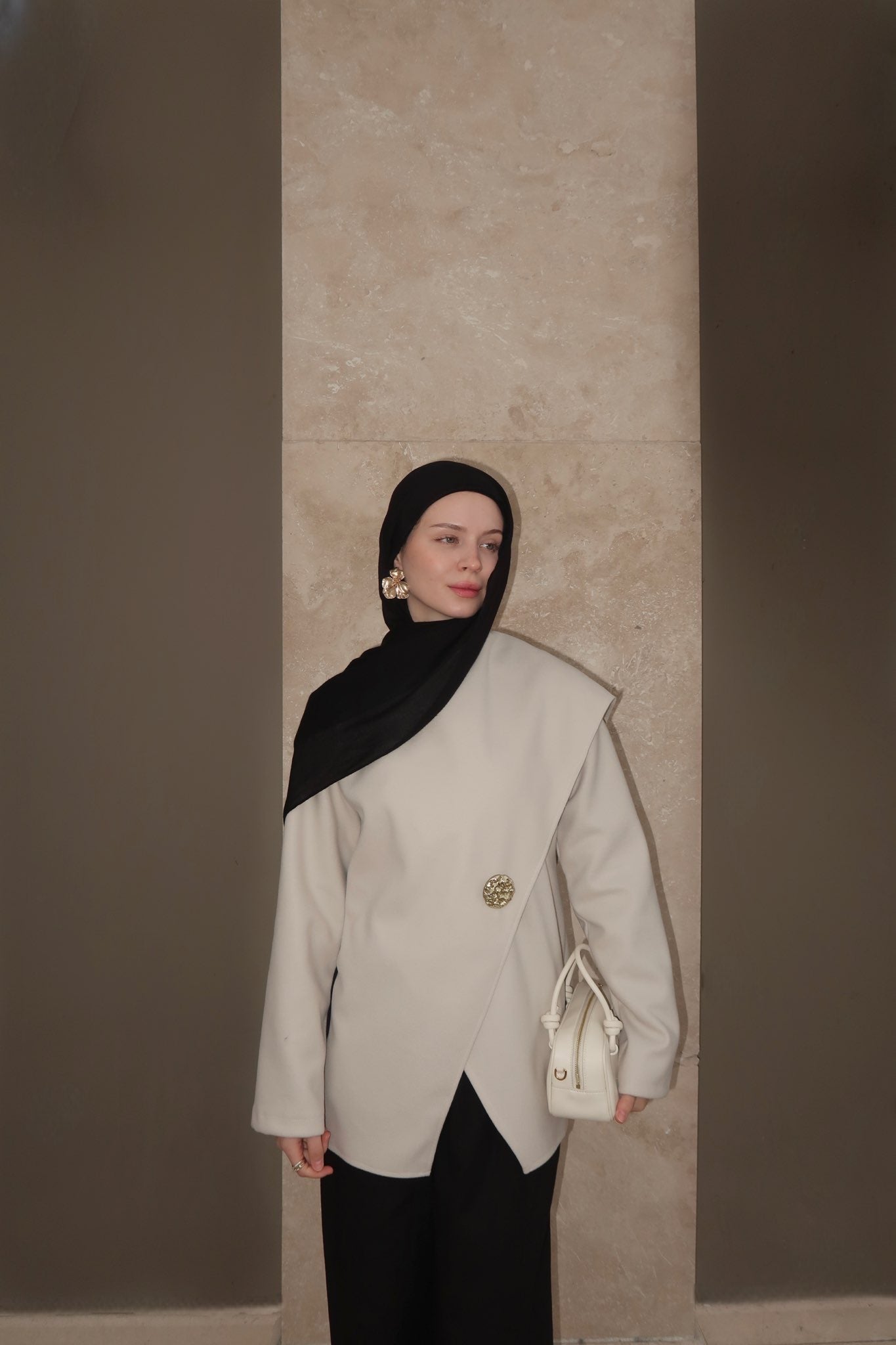 A chic beige asymmetrical top with a draped front design and a statement button closure. A soft scarf detail cascades over the shoulder, adding elegance and flow to the modern silhouette.