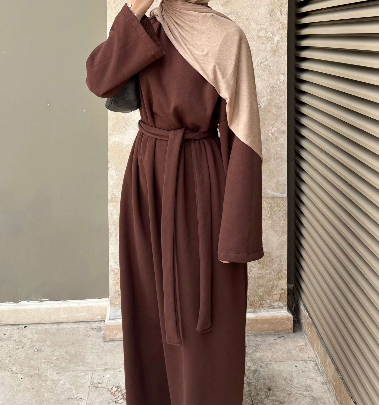 This dress features a relaxed, loose fit with dropped shoulders and long sleeves, crafted from soft sweatshirt fabric with a brushed interior for ultimate comfort. It includes a round turtle neck and a matching robe made from the same fabric.
